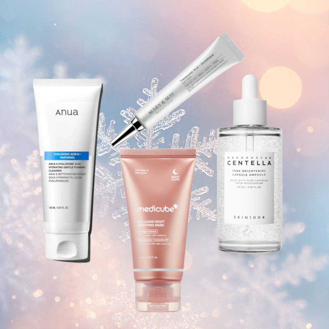 Il detergente Anua Hyaluronic Cleansing Foam deterge delicatamente preservando l’idratazione, mentre l’ampoule illuminante Skin1004 aiuta a migliorare il tono e la texture della pelle. La Medicube Night Wrapping Collagen Mask agisce durante la notte per una pelle più compatta e rimpolpata al risveglio, completata dalla Mary & May Glutathione Eye Cream per uno sguardo più luminoso e fresco. Ideale per chi desidera una glow routine efficace e bilanciata.